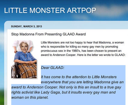 Поклонники Леди Гаги именуют себя "маленькими монстрами", и иногда это название стоит воспринимать буквально. На днях группа "маленьких монстров" адресовала письмо Гей-лесбийскому альянсу против клеветы GLAAD - после того, как узнала, что на церемонии вручения наград этой организации, которая пройдет 16 марта в Нью-Йорке, специальную премию имени Вито Руссо журналисту Андерсону Куперу, открытому гею, будет вручать Мадонна. Они считают, что Мадонна не имеет права этого делать, поскольку ответственна за распространение ВИЧ/СПИДа. И что истинной гей-активисткой является не Мадонна, а Леди Гага, поэтому представлять Купера во время церемонии должна именно она.