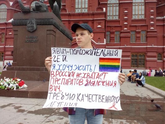 Юноша, известный в соцсетях под ником Steve Suvorov, держал плакат: "Я - ВИЧ-положительный гей, я хочу жить. В России не хватает лекарств для лечения ВИЧ. Требую качественного лечения".